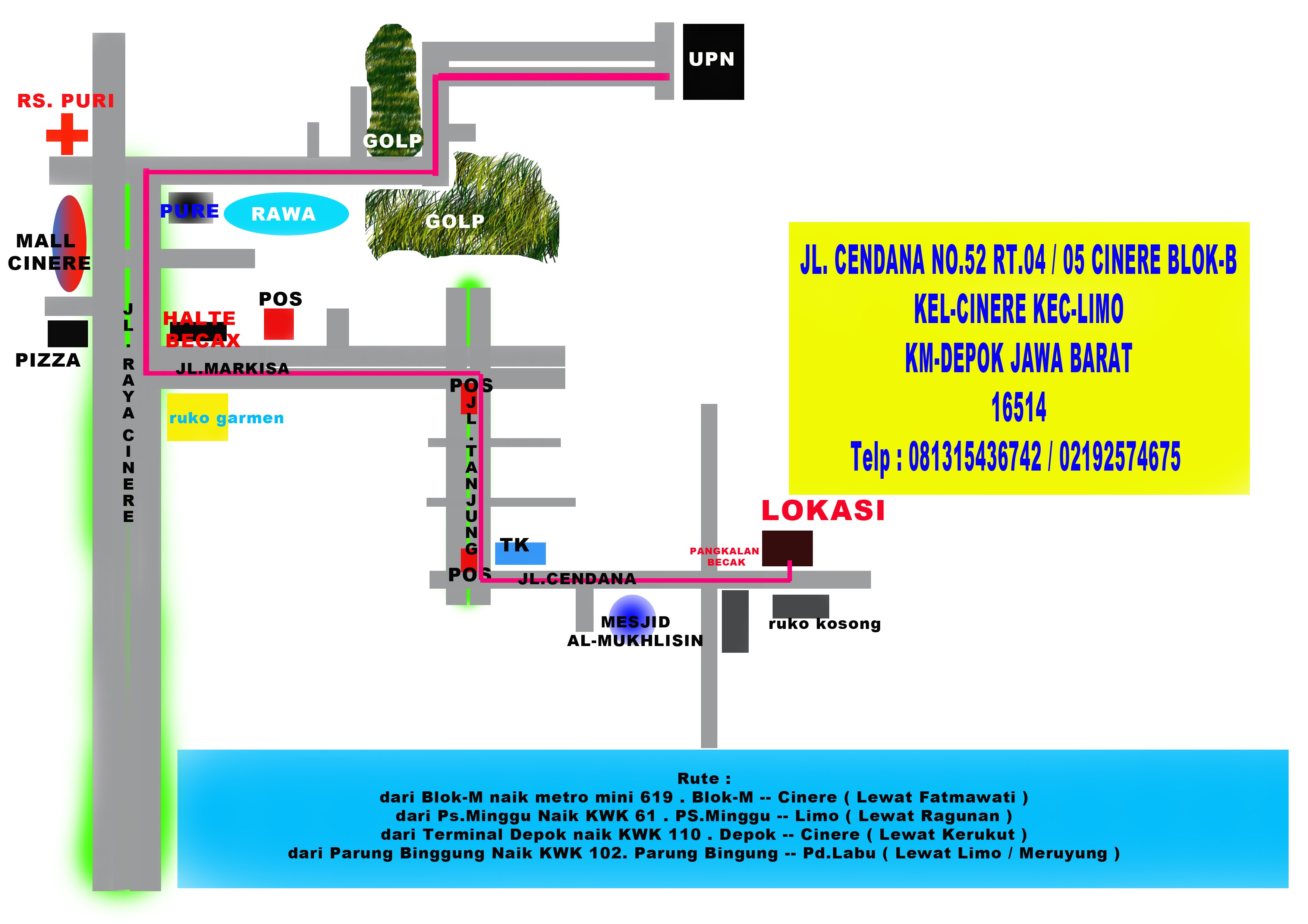 Alamat office : Jl. Cendana No.52 RT.04 /05 Cinere Blok-B . Depok 16512